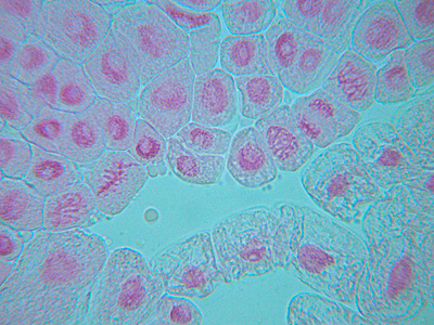 体細胞分裂の過程は、紙面上で理解していても、やはり、実物を見ると理解度が高まります。教科書の写真よりも、苦労して、顕微鏡下で細胞を観察できた方が、生徒達も教科書と一緒だと納得してくれます。しかし、最近は、体細胞分裂の過程が見られるプレパラートを用意していても、顕微鏡下で探し出す根気が続かず、すぐにあきらめてしまう傾向にあります。そこで、どのプレパラートからも必ず間期以外の細胞が見つかることを示すために、各班の顕微鏡1台だけ、教員が分裂期が見られる箇所を探してあげる、または、パソコン画面(図1、2)に表示してあげると、残りの班員達も自分の顕微鏡でもう一度、一所懸命に探し始めます。ただ、やっと要領を得た頃に、時間がきてしまうので、実物を見られたという達成感だけの実験になってしまいます。その後は、各分裂期の時間経過の推測をするために模擬データー(視野の中に見える各期の細胞数を集計した表、または、顕微鏡写真)を与え、全体の細胞数に対する各期の細胞数の割合を求め、各期の実際の時間を推定し、レポート提出をさせています。
