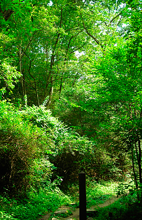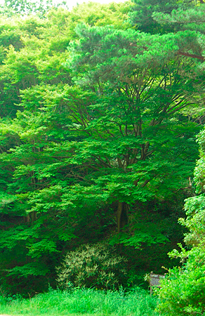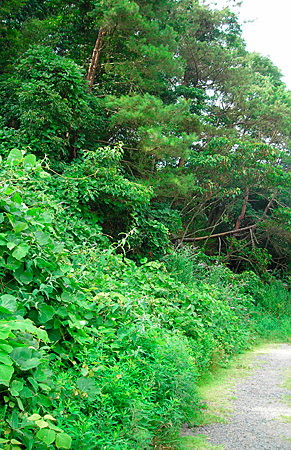 参加者は3名でした。1人で引率し,安全管理をしつつ観察指導を行うにはよい人数でした。幸い2日とも夕立ちにも遭わず,マムシやスズメバチにも遭遇せず,用意した救急用装備一式も使わずに済みました。2日とも,ほぼ予定時刻どおり行動できました。 (1日目)ハイキング道(山田道)に入る前に,行程と観察目標を再確認し,安全上の注意点(スズメバチとマムシ)を確認した後,相観と階層構造を観察し(図1),優占種と標徴種の目星を付けて,林内に移動開始となりました。マント群落を観察しながら(図2),その意義を説明しつつ,砂防堰堤の上流側と下流側の動植物相の違いを観察し,砂防堰堤の功罪を考えました。林内の樹種と樹高,沢の様子などから,この山が採炭林〜建材植林地〜放置林と変化してきたこと(森と人の歴史)を見ていくうちに河原に出ました(図3)。オイカワの分布と行動を観察しながら進むと,ササ〜シノダケ群落の湿地を通ってスギ植林地に至り(図4),ここで林床と林内の小川のリター(還元分解層)がそれまでのアベマキ〜コナラ,ヤシャブシ林の林床とどのように違うかを確認して林を抜けました(図5)。道端のススキ群落で,生産構造がイネ科型と広葉型の両型が見られることをスケッチによって確かめながら,その理由を考えました(図6)。土砂採取場の脇を抜けて土壌環境を観察したあと,わずかに残るブナ林を通って植物園正門に15:20に到着しました。来た道を戻り,16:10分に谷上駅で無事解散しました。 (2日目)1日目と同じ道を通って植物園に到着。植物園内を針葉樹林区(ツガ・トウヒ)〜照葉樹林区〜夏緑樹林区(図7),〜北米区の順に見て回りました。林床の違いと,下層葉の分布に注目しながら,耐陰性が成長と共に変わっていくことを観察して15:00に植物園をあとにし,15:40谷上駅で無事終了解散しました。