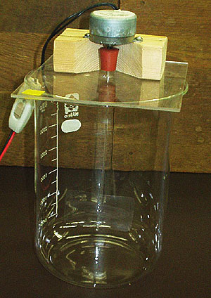 | 本校は1学年が10クラスあり,その全クラスで観察を実施している。このため,大量の胚が必要になる。あらかじめ受精させておいた胚は,遊泳を始めるふ化以前,ごく低密度であれば問題ないが,2リットルのビーカーでもわずかに目に見える程度の密度で底に沈殿し,酸欠のためか正常な発生がさまたげられる。これを解決したのが小林の考案した撹拌装置(図)である。低速回転モーター(30rpm)にプラスチックの羽根をつけた簡単なものであるが,海水をゆっくり撹拌し胚を正常発生させる。低速回転モーターは限られた時期にしか製造されないらしく,地方では手に入りづらいが,秋葉原の電気部品店の店頭には1個千円程度で積まれていることがあるとのことである。 |