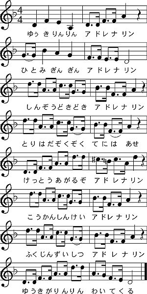 | 2) | チロチロチロチロ チロキシン 甲状腺から チロキシン ちろちろちろちろ 火がもえる 体の中で 火がもえる 代謝が上がるぞ 熱が出る ヨードが四つだ チロキシン 分化の促進 チロキシン チロチロチロチロ チロキシン |