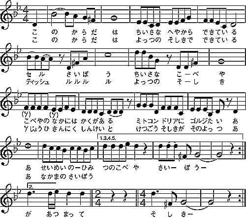 | 1) | この体は 小さな部屋から できている セル 細胞 小さな 小部屋 小部屋の中には 核がある ミトコンドリアに ゴルジ体 あぁ 生命の 秘密の小部屋 細胞 |