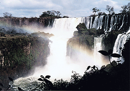 | 世界最大のイグアスの滝は,アルゼンチンとブラジルの国境を流れるイグアス川にかかっています.幅4km,最大落差80m,水量毎秒6万5千トンもあり,轟くような水音と大地を揺るがすような振動が響いてきます.そしてあまりの水量の多さに目をみはります.また滝の付近にはきれいな虹がかかり,水の色と木々の緑が美しい景色をつくり出しています. イグアスの滝へはアルゼンチンのブエノス・アイレスから飛行機で1時間40分でプエルト・イグアス市ヘ.ここからバスに30分乗ると,イグアス国立公園の入口に着きます.入場券を買い,再びそのバスに乗り滝近くにあるビジターセンターで降ります.そこからはよく整備された遊歩道に沿って歩いていくと滝のすぐ下に着きます.真上から流れ落ちてくる水の激しい音とエネルギーに圧倒されます. 滝はアルゼンチンとブラジルの国境にあるため,ブラジル側からも見ることもできます.滝から少し下流に行くと,国境の橋タンクレード・ネべス橋があり,国境で簡単なチェックをへてブラジル側に入ることができます.ブラジル側から見ると,イグアスの滝のほぼ全体を見渡すことができ,大小約300もの滝が集まってできていることがよくわかり,そのスケールの大きさが感じられます. 滝付近をつくっている岩石は,約1億年前の火山噴火によってできた岩で,その後の変動で陥没して滝がつくられたと考えられています. |