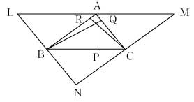 [証明1]Aを通り辺BCに平行な直線,Bを通り辺ACに平行な直線,Cを通り辺ABに平行な直線を描き,図のように△LMNを定める。また,3本の垂線の足をP,Q,Rとする。△ABC≡△BAL≡△CAMであるから,LA=MAとなり,AはLMの中点。さらに,BC//LMなのでAPはLMの垂直二等分線である。同様に考えると,3本の垂線の交点は△LMNの外心であり,確かに1点に定まる。