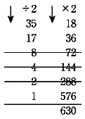 | 2進法は、全ての桁の数を0と1を基にした数値で表現され、コンピュータでの演算に用いられる。この発想を利用して、35×18の計算を、次のようにすることができる。