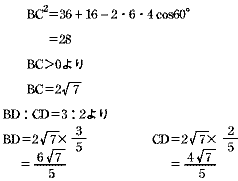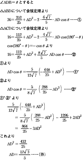 ところが、生徒達は面積を使うというところへ発想がいかないらしく、余弦定理や正弦定理だけを用いて解こうとして試行錯誤している。次に紹介するのは、数学の成績が良いA君の答案である。