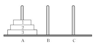 3本の杭に A、B、C の名前を付ける。最初Aに3個の円盤があり、次のようにCにすべての円盤を移動させる。 [1] 円盤1を A から C に移動する。