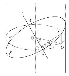 筒袖を半径 r の円柱と見立てると、軸上の点Oを通って軸と垂直な平面をα、また点Oを通って平面 α と θ0 の角をなす平面を β とする。円柱が平面 β によって切られる切り口の曲線上の任意の点Pから下ろした垂線の足を Q、Q から平面 α と β の交線 へ垂線QRを引き、∠AOQ=θ とする。