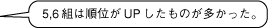 実は1学期の期末考査の結果、大きな有意性は見られなかった。上位クラスにいったもの、下位クラスにいったもの、3つの組で数字はほとんど同じであるといえる。習熟の方法はあまり意味がないのではとも思ったが、ただ顕著だったのは資料1における5,6組の順位UPの人数だけが、他のそれとはまったく違う結果がでたということで、これは注目すべき点であるとは思う。また3,4組と5,6組の両方の授業を行っている担当者に言わせると、「 3,4組は αββの方がいい」とのことであった。その理由として「この両クラスには下位層の生徒も多いので、γとして特化してしまうと授業の雰囲気に悪影響がでるので、平均的な生徒と同じクラスにして、授業の雰囲気を大切にしていきたい」とのことであった。確かに本校ではクラス自体に色々な雰囲気がでてしまうことがあるので、クラス単独の授業を1年間続けるより、どのような形にせよ、習熟別クラスという名目として他クラスを交えての授業の方が、万が一しんどいクラスができても授業を成立させることができると考える。 |
