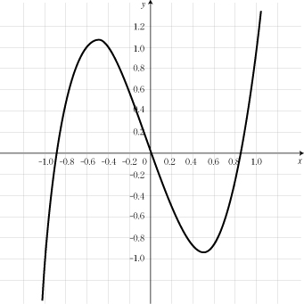 このことで,-1< x <1の区間に異なる実数解を3つ持つことがわかりました。