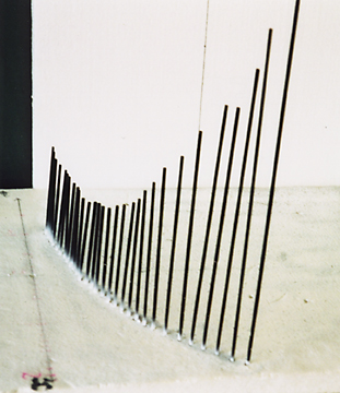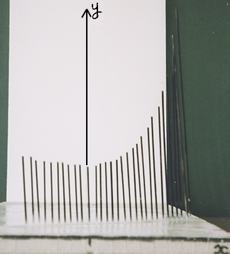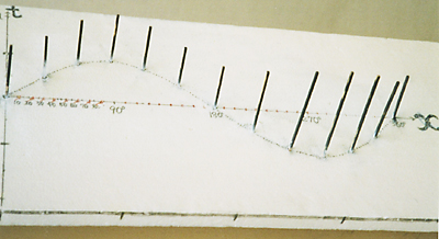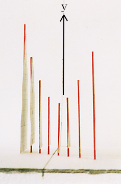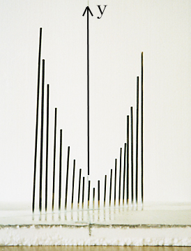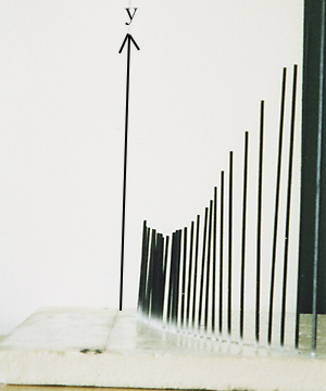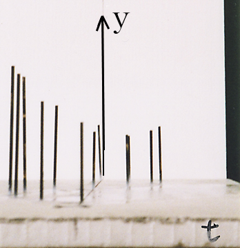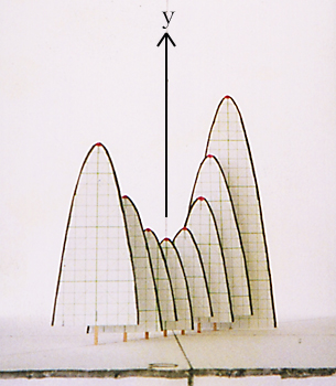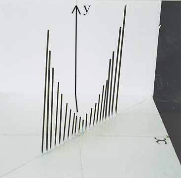ここで、m の値を連続して動かしたいとき、棒を多く立てればよく、m と x と y を含めた全体の様子(ア)が、よくわかる。xy 平面を正面から見ると(イ)のグラフになり、この棒グラフがまるで xy 平面に正射影されているように見える。実はこれが「パラメーターの文字を消去」したことになっているのである。