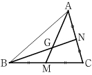 右の図のように,△ABC があり,2辺 BC,CA の中点をそれぞれ M,N とする。また,2つの線分 AM と BN の交点を G とするとき点 G は線分 AM を 2:1 に内分することを示せ。