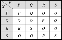 また,P, Q, R, S の相互の乗積表を作ると,下表のようになる。(XY の値を記している。)