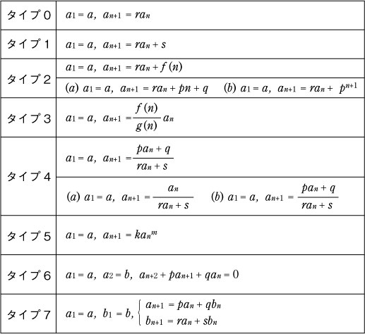 | これらは一見すると別物のように見えるが, 逆に, つまり,等差数列と等比数列は見方を変えることで同一視できるのである。 この探究では,一見すると別物に見えるいろいろな漸化式をうまく変形することで,既知の漸化式に帰着させて「漸化式のタイプ」の集約を行って,一般項を求められるようになることをねらいとしている。 次の表は,まとめのページに載せた漸化式のタイプである。