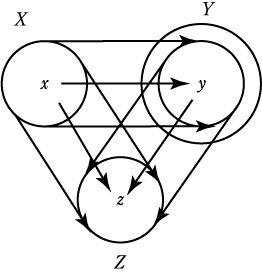 | では,最大濃度は存在するのか, そこで,集合論では,部分集合の集合を定義し集合族という。 例えば,X={ a,b,c } の集合の部分集合は, であったが,集合族とは冪集合で表し,X={ x,y,z } の冪集合は,2X と書いて 2X={ となる。 写像 X →2X は,x →{ x } に対応させると単射であるから, Card.( X )≦Card.( 2X ) である。また,この等号は成り立たない。 つまり,この写像は全射ではない,集合X の冪集合 2X の濃度は,X の濃度より大きい。 『全射ではない』ことを説明するには,『全射である』と仮定して矛盾を引き出す。a に対応した部分集合Aa(対応のみであり,a が入るというわけではない)と書くことにする。 イメージ図