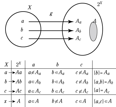 全射であると仮定して,自分の像になっていない X の要素全体A を用意すると [証明]X を任意の集合とし, 2X を集合とし,X ⊃ 2X ,X ⊂ 2X が成り立つ。