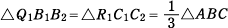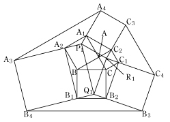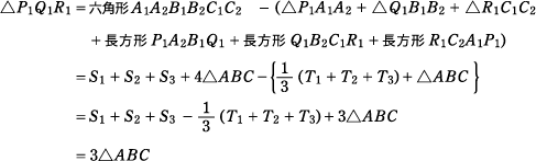 (1) A1P1 = C2R1, B1Q1 = A2P1, C1R1 = B2Q1 (2) (3) △P1A1A2 = △Q1B1B2 = △R1C1C2 = (4) △P1Q1R1 = 3△ABC が成り立つ. [証明]