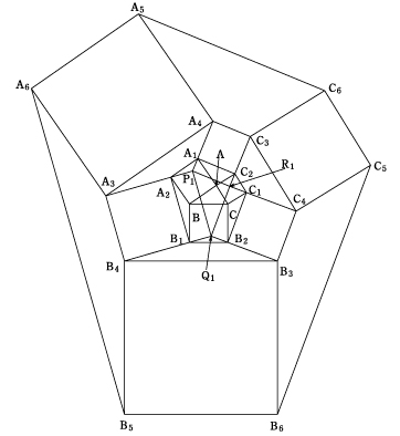 [補題.1] 三角形 ABC の辺上に,正方形 AA1A2B, BB1B2C, CC1C2A を左回りにつくり,さらに正方形 A2A3B4B1, B2B3C4C1, C2C3A4A1 を左回りにつくる.正方形 AA1A2B = S1, 正方形 BB1B2C = S2, 正方形 CC1C2A = S3, 正方形 A2A3B4B1 = T1, 正方形 B2B3C4C1 = T2, 正方形 C2C3A4A1 = T3 とおくとき, T1 + T2 + T3 = 3(S1 + S2 + S3) が成り立つ. [定理.2] 三角形 ABC の辺上に,正方形 AA1A2B, BB1B2C, CC1C2A を左回りにつくり,さらに正方形 A2A3B4B1, B2B3C4C1, C2C3A4A1 を左回りにつくる.直線 A1A4 と直線 A2A3 の交点を P1,直線 B1B4 と直線 B2B3 の交点を Q1,直線 C1C4 と直線 C2C3 の交点を R1 とすると,