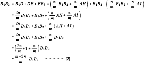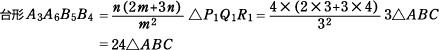 (2)[定理.2]-(2) によると, だから,[定理.1]-(2),[定理.2]-(4) により m = 3, n = 4 とすれば 同様にして, 台形 B3B6C5C4 = 台形 C3C6A5A4 = 24△ABC が成り立つ. (Q.E.D.) 参考文献 |