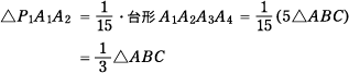 (1)[系1]-(1) によると, (2) 同様にして, が成り立つこともわかる. (3)[系1]-(2) によると,台形 A1A2A3A4 = 5△ABC だから, が成り立つこともわかる. (4)[系1],[定理.2]-(1),(2),(3) によると,