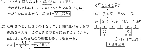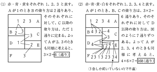 (3) 考え方や式の成り立つ根拠を言葉で表現すること 理解が曖昧なために、漠然と授業で学習した考え方や公式を使ってしまう生徒がいる。なぜ、和の法則や積の法則、あるいはPやCを使うのか、その理由を言葉で表現する。頭の中だけで考えた解答は、勘違いしていることが多い。そのため、自分の考えに錯覚がないかを、自分で発見できるように考え方を言葉で表現する。自分の考えを文章にし、整理することで、その解答が初めて正しいと確認でき、そして、ときには自分の考えの間違いに気づくのである。根拠を明らかにし筋道を立てて論理的に考えを進めることができる、思考力・表現力を身に付けさせる指導の充実を図っている。