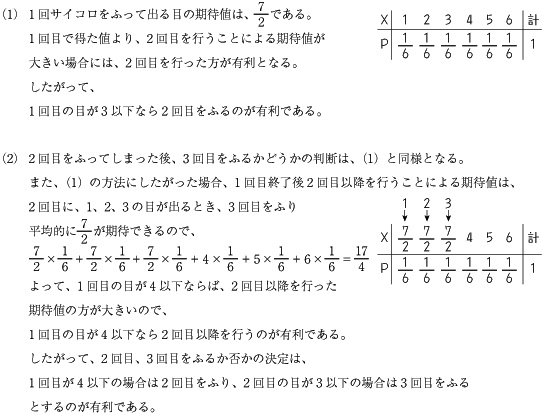 サイコロを1回ふり終わった時点(現在)で、すでにふり終えた1回目の目(過去の目)と、これから2回目をふったときに起こりうる目(未来の目)をどのようにして比較するかを考えたときに、期待値を利用して問題を解決できるかが問われている。