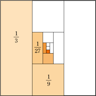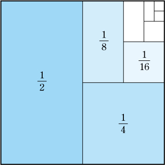 上図のように一辺が1の正方形を順次切り分けていくと徐々に面積は1に近づいていくが,決して1を超えることがないことがわかる。