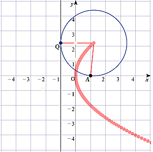 数学 II の図形と方程式の分野にも出てくる問題であるが、放物線の定義を考える上でわかりやすい問題である。Grapesの画面を黒板やスクリーンに投影して条件を満たす円を動かしてみせ、中心の軌跡が放物線を描くことを提示する。