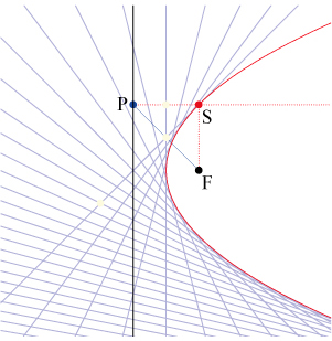 この理屈を説明するにもGrapes使って見せるとよい。包絡線は焦点と準線上点を結ぶ線分の垂直2等分線になっているので、準線に垂直に向かった光線は放物線で反射して焦点に集まる様子がよく分かる。