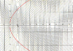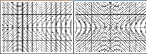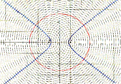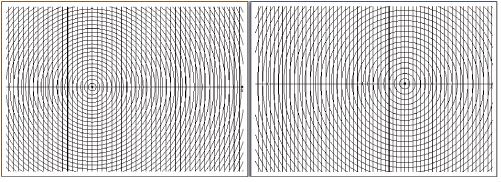 同心円と平行線、2つの同心円が同じ幅で描いてある。干渉縞(モアレ)として放物線や双曲線が既に見えているので、黙って配ってもおもしろい。 |