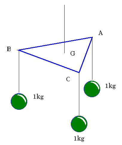 重さのない三角形△ABC の各頂点に,1kgずつのおもりをぶら下げた場面を想定する.