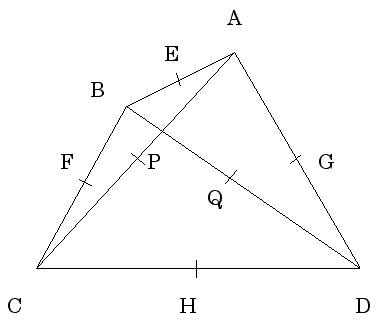 発展問題 四角形 ABCD の辺 AB,BC,CD,DA の中点をそれぞれ E,F,H,G とし,対角線 AC,BD をそれぞれ M,N とする.このとき,3つの線分 EG,FH,MN は共通の1点で交わる.