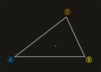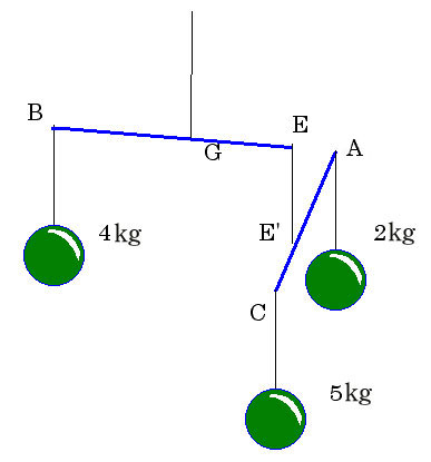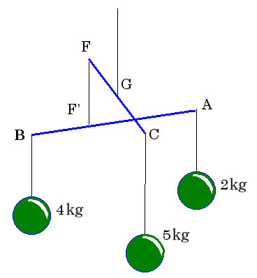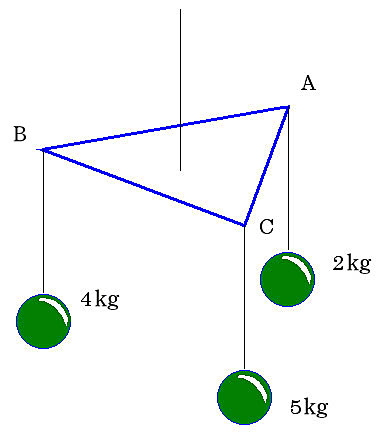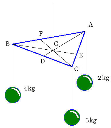 次の例で考えよう。重さのない三角形△ABCの頂点A,B,Cにそれぞれ2kg,4kg,5kgのおもりがぶら下がっているとする。
