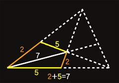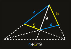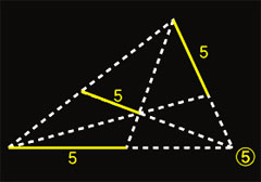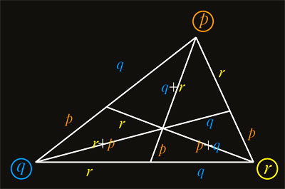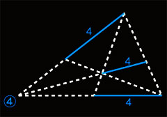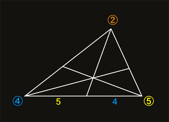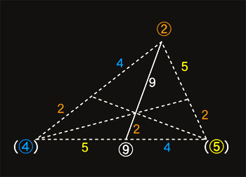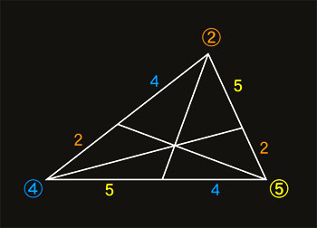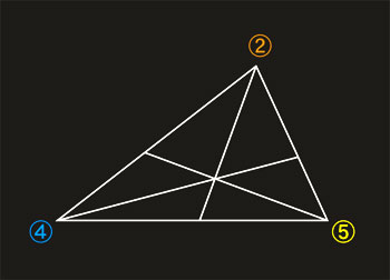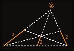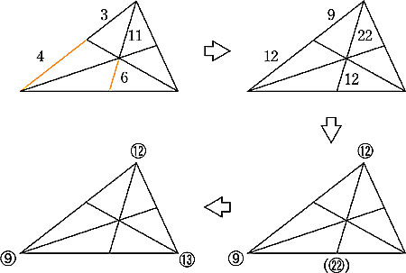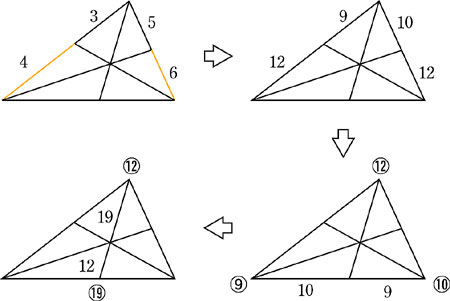 各頂点と重心を結ぶ線分につける数は次のように足し算で求められる。