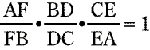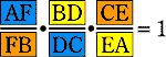チェバの定理 △ABCの内部に1点Gがあり,線分AG,BG,CGの延長が対辺と交わる点をそれぞれD,E,Fとするとき,次の公式が成り立つ。