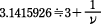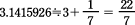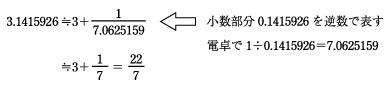 | 今回は電卓を用意してください.(以下の計算は8桁の電卓を使用した) ある数の近似値といえば,小数で表すのが普通であるが,まれに近似値を分数で表すことがある. 例えば,円周率 π=3.1415926の近似値として,昔から という分数による近似値が知られている. と表すことを考える(νは整数). だから, つまり,3.1415926の小数部分0.1415926の逆数がほぼ νである. となるのである.
