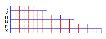 この平行四辺形の面積が (a+b)h だから,台形の面積はこの半分になるわけである. 5,8,11,14,17,20 という等差数列は次のような図で表すことができる.