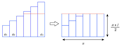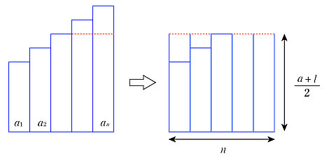 この公式は,「台形の面積の公式と同じ」と覚えるとよい. 初項 a,末項 l,項数 n である等差数列の和 は, 上底 a,下底 l,高さ n である台形の面積 と同じである.
