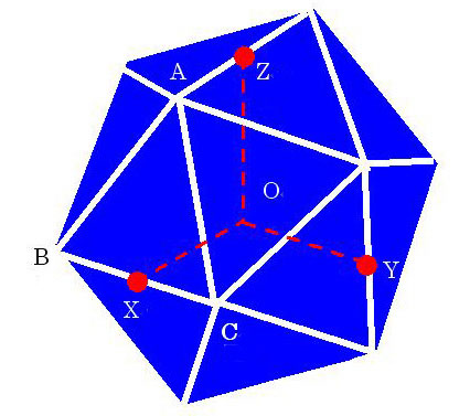 この体積を求めてみよう. 下図においてOは正二十面体の中心,A,B,C は頂点,X,Y,Z は辺の中点とする,X,Y,Z をのせる3辺は直交している.これら3点と正二十面体の中心 O をむすぶ線分は互いに直交する.つまり,直線 OX,OY,OZ は空間座標系の座標軸の位置にある.