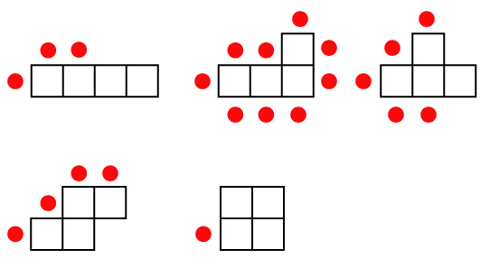最終段階は,これらの図形にもう1つの正方形をくっつけて,なん種類の図形ができるか調べる作業である.
