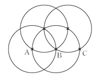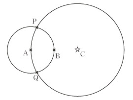 Aを中心としBを通る円と,Cを中心としAを通る円を描き,交点をP,Qとする.