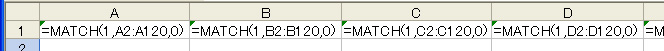式「=MATCH(1,A2:A120,0)」はA2からA120までの数列で1にちょうど一致するものの番号を表示せよという意味である.
