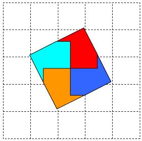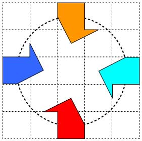 [1] 4部品を次の位置まで移動. ただし,4部品を1つずつ動かすのではなく,4部品が同時に中心から離れるように動かしてください.グリッド線,円は作図のときの参考です.