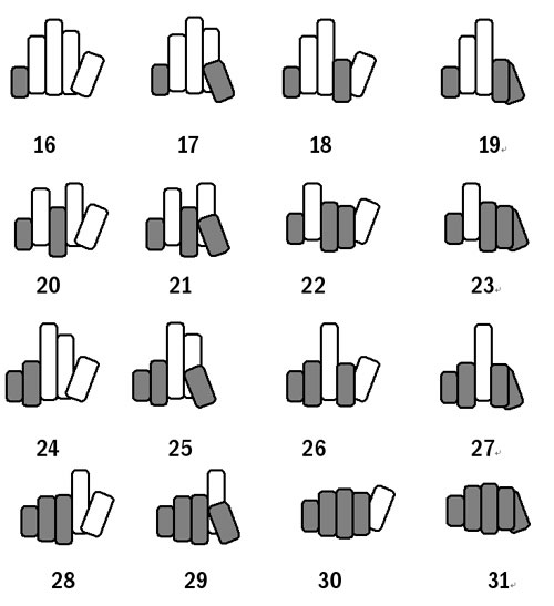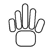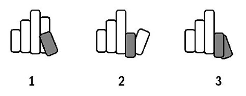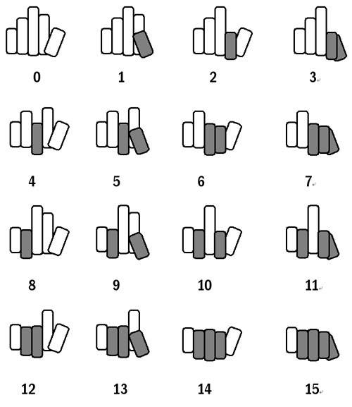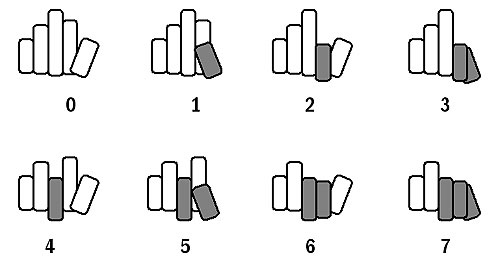 1つ玉そろばんの話はここまでとする.最初の指の運動に話を戻そう. 0 ここに1が入る.親指がいつも1が加えられる入り口である(下図). 1 ここに1を加えたいのであるが,1の入り口である親指は目下取り込み中(入ってます)である.しかたがないので,無理やり1を入れて繰り上がり処置によりこのピンチを切り抜ける.この場合、繰り上がりというのは人差し指を折ることである(下図). 2 次に自然に1が加えられる(下図). 3 今度は親指も人差し指も取り込み中である.ここで無理やり1を入れると親指と人差し指の地点で繰り上がり現象が起こる(下図). 4 以下同様である.