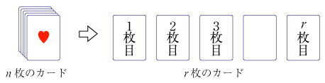 「r 枚を取り出して並べる」といったが計算をよく見ると、はじめに r 枚のカードの組合せを取り出しているわけではない.r 枚をいっぺんに取り出すのではなくて、じっさいは、1枚ずつ取り出すことを r 回くりかえしている.