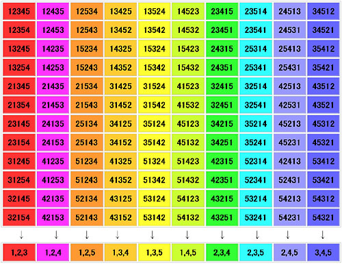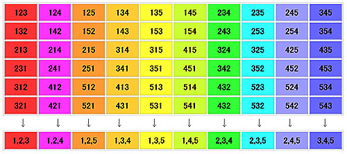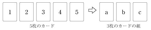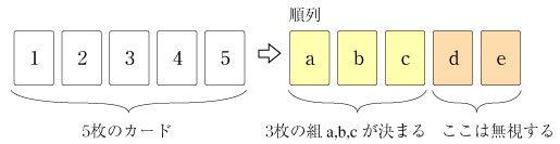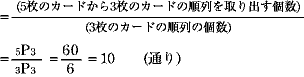 そこで、3 枚のカードの組を手に入れるために、 順列 例えば、1、2、3のカードの組合せは1、2、3の順列 123、132、213、231、312、321 から得られる. 5C 3