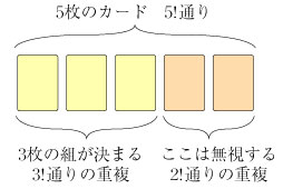 となる. 3.組合せの個数 nCr (別の見方) 組合せの個数 nCr を入手するのに別の方法を考えよう. 5 枚のカードから 3 枚のカードを入手する方法として、5 枚のカードすべての順列を考え、はじめの 3 枚が 3 枚の組を決めると考える.