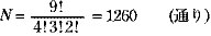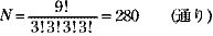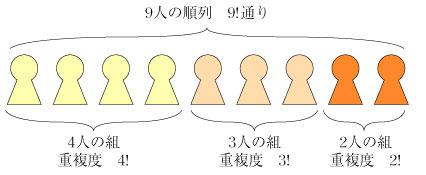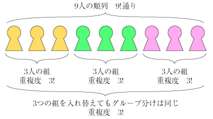 求める個数 N は、 5.9人の人を3人ずつ3つのグループに分ける やはり、9人の順列を3人、3人、3人と分割してグループ分けを入手するが、組どうしの入れ替えが可能であることに着目する.