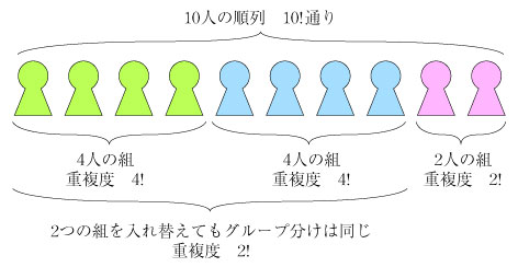求める個数 N は、 同様に、10人の人を4人、4人、2人のグループに分ける場合は,