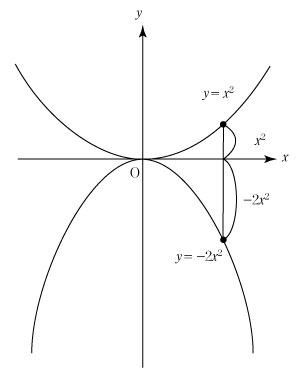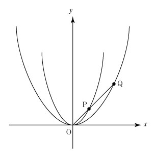 | I 放物線 y = ax2 (a ≠0) はどれをとってもすべて相似である. まずこれを示そう. 放物線 y = ax2 を原点を中心として a 倍に拡大してみよう. 放物線 y = ax2 上の任意の点 P (x1,y1) をとる. 原点 O を中心として OP を a 倍に拡大した線分を OQ とすると,点 Q の座標は Q (ax1,ay1) である. y1=ax12 であるから, ay1=(ax1)2 したがって,点 Q は放物線 y = x2 上にある. 以上により,放物線 y = ax2 は放物線 y = x2 と相似であることが示された. どの放物線 y = ax2 も放物線 y = x2 と相似であるから,すべての放物線 y = ax2 は相似である.