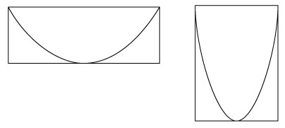 図のように,長方形に入った2つの放物線がある場合,一方の長方形が他方の長方形に重なるように縦・横に拡大・縮小すると,これに連動して一方の放物線が他方の放物線にぴったり重なる.
